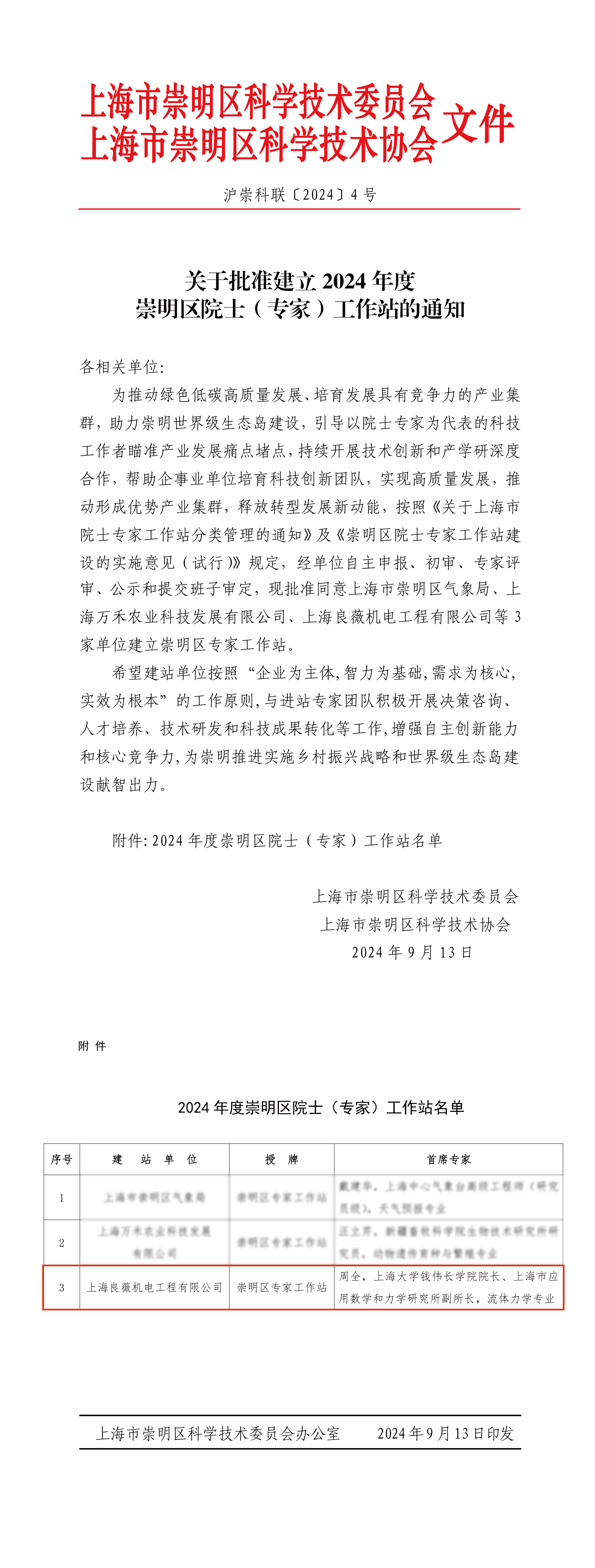 经单位自主申报、初审、专家评审、公示和提交班子审定,现批准同意上海良薇机电工程有限公司等3家单位建立崇明区专家工作站